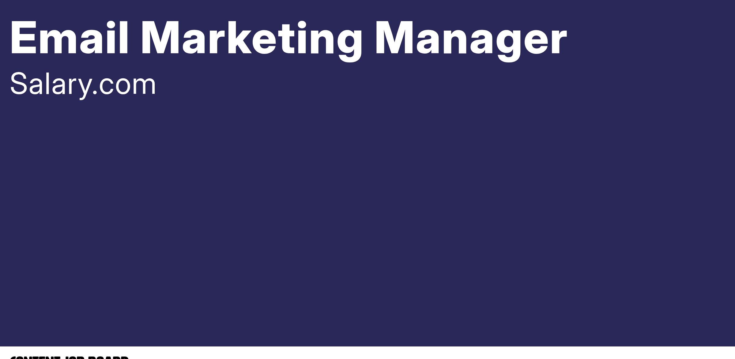 Are you a driven individual looking to advance your career representing an innovative, fast-growing company? Would you be excited to develop your skills and learn more about the compensation industry? Salary.com is looking to add a smart, energetic, and self-motivated Email Marketing Manager to our amazing team!