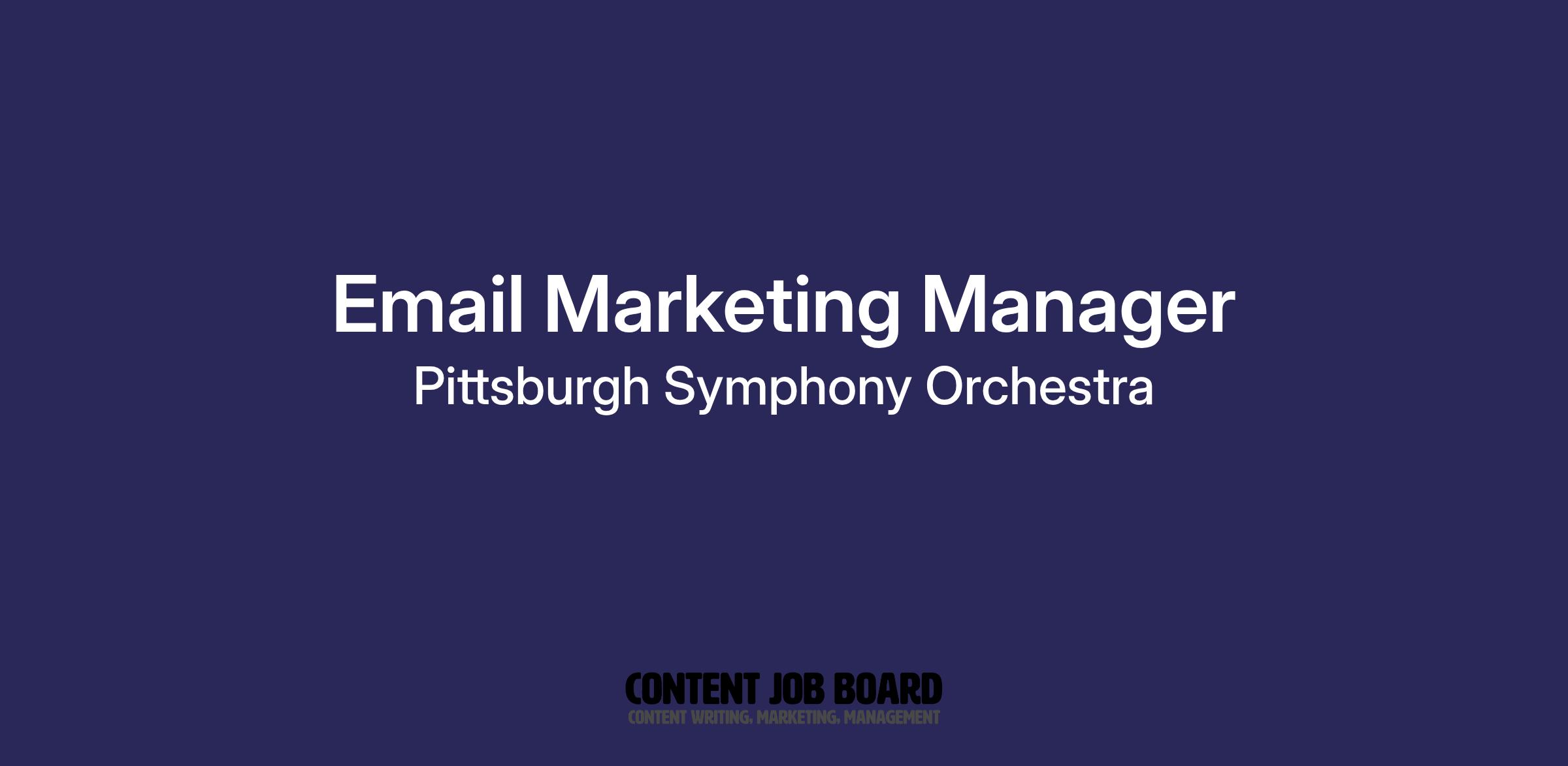Job Purpose:The Marketing and Communications team is responsible for developing the Pittsburgh Symphony Orchestra’s (PSO) audiences through targeted campaigns, outstanding online content, PR opportunities, brand development, and online community management. The Email Marketing Manager will oversee the PSO’s email campaign planning and execution including designing, testing, and analyzing campaigns to measure and report on effectiveness. The person stepping into this role will have an eye for graphic design, experience with content strategy, and technical email development skills. Under the supervision of the Director of Marketing, the Email Marketing Manager will be responsible for creating, managing, and optimizing outbound email campaigns. This position also will use analytical tools to drive performance improvement.