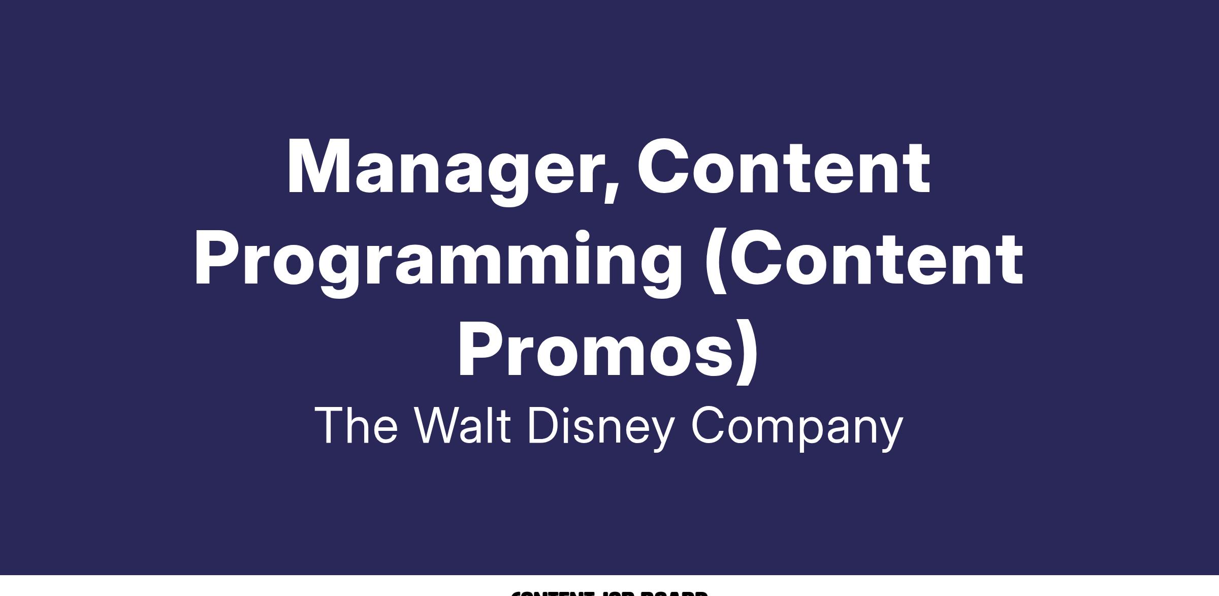 Disney’s Global Content Programming team is looking for a Manager, Content Programming (Content Promos) to lead efforts in supporting our business and editorial priorities, aiming to achieve engagement objectives across Disney+ and Hulu, with a focus on driving video content promotions for both platforms.