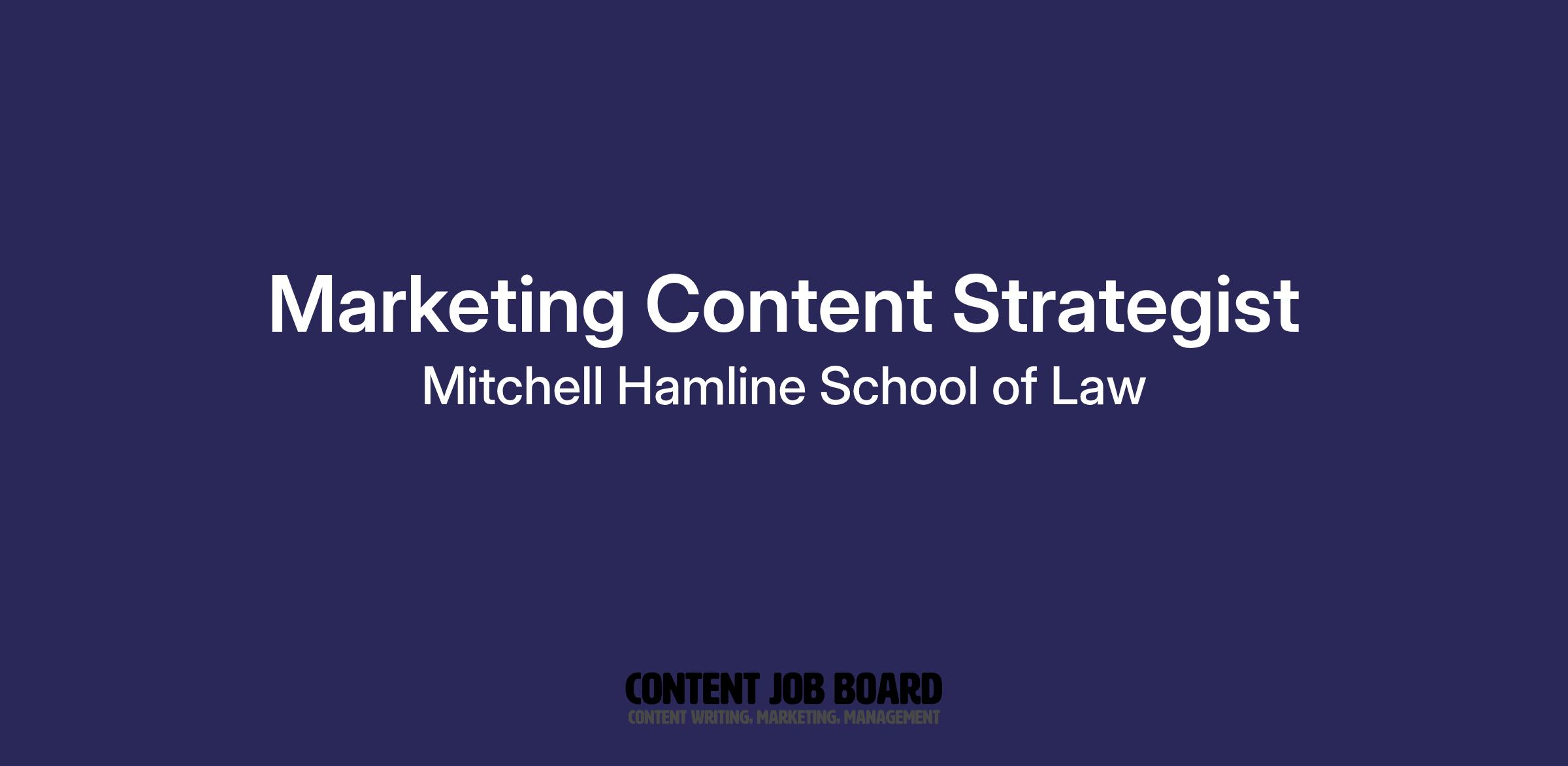Mitchell Hamline School of Law is seeking to hire a full time Marketing Content Strategist. This position develops, executes, and measures a comprehensive content strategy that strengthens Mitchell Hamline's brand, drives enrollment, engages current students, faculty and staff, and builds relationships with alumni, donors, employers, and peer institutions. The Marketing Content Strategist will design and lead the internal communication efforts across campus and external cross platform communications for marketing and advancement requiring specialized knowledge and expertise.