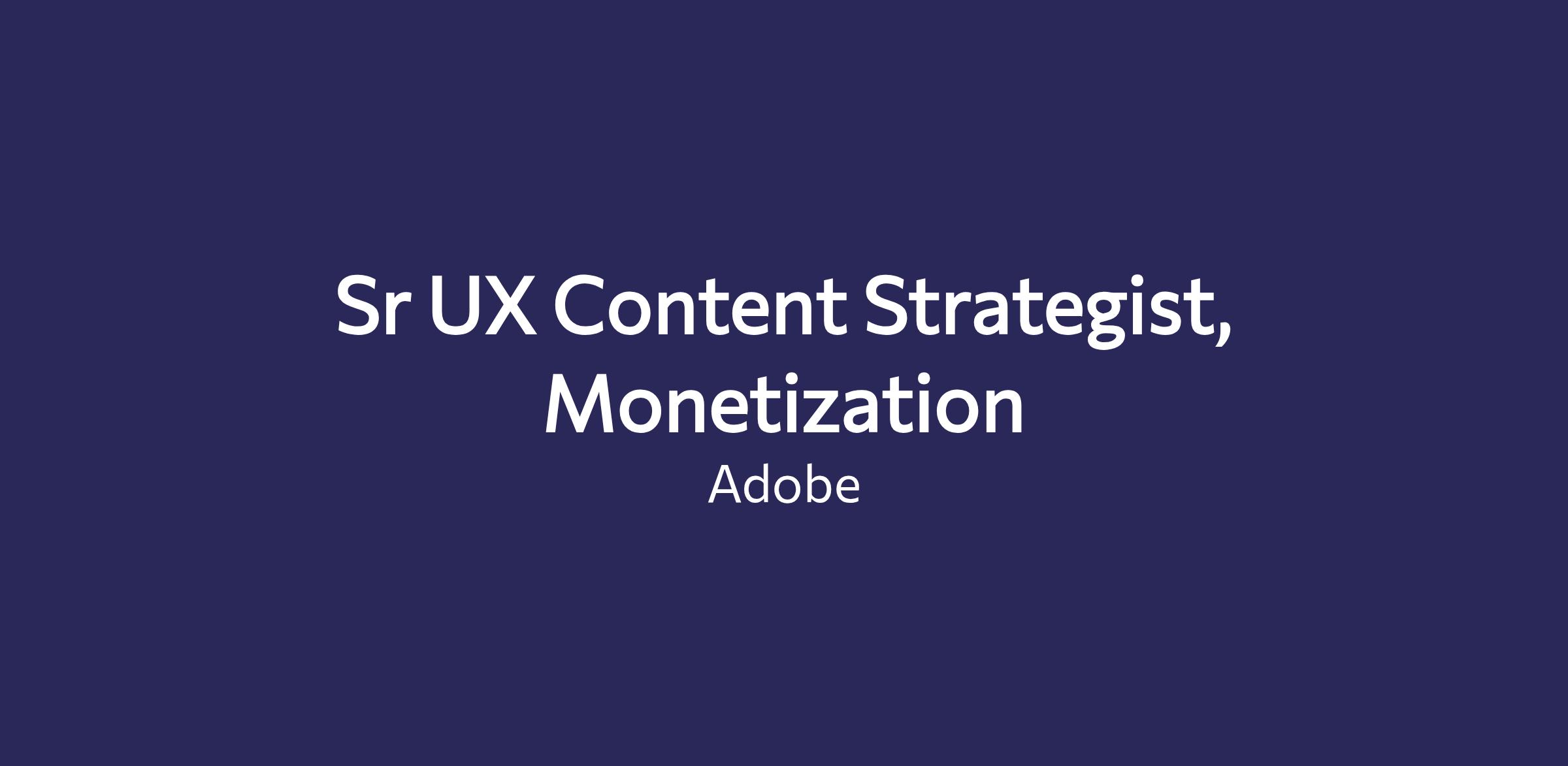 We’re looking for an experienced Sr. UX Content Strategist to join Adobe’s Monetization Growth team! You will develop the language behind some of Adobe’s most critical revenue-driving experiences.